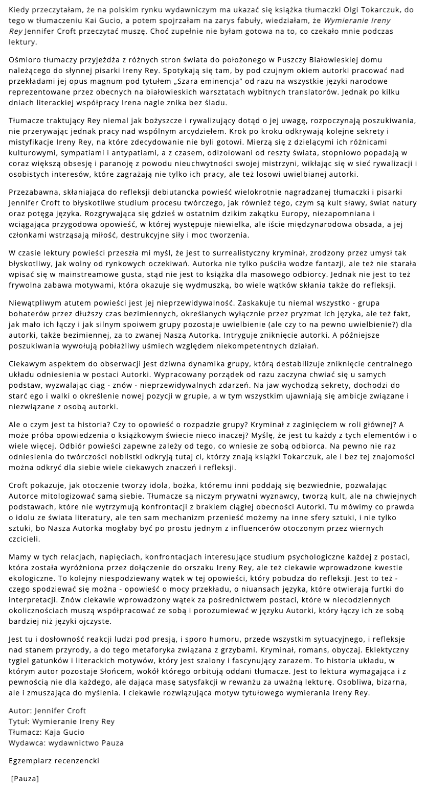 Jennifer Croft, „Wymieranie Ireny Rey” – recenzja powieści na blogu „Zaczytasy”