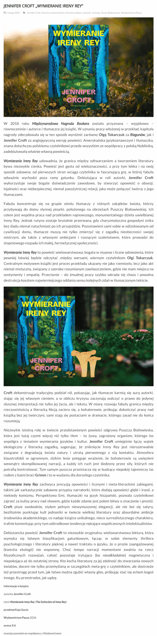 Debiutancka powieść Jennifer Croft to niezwykle oryginalna, wielowarstwowa lektura, która wymyka się łatwym klasyfikacjom gatunkowym, łącząc w sobie elementy thrillera psychologicznego i literatury pięknej a nawet traktatu o języku, że o prozie zaangażowanej (kwestia ekologii) nie wspomnę. Choć tempo narracji momentami zwalnia na rzecz filozoficznych rozważań, całość pozostaje irytująco (bo nieodkładalnie) magnetyczna i niepokojąca aż do ostatniej strony. Kto kocha literaturę za jej zdolność do stwarzania nowych światów, doceni nie tylko przemyślaną w szczegółach meta-grę z czytelnikiem, ale dostrzeże też przestrogę przed tym, jak łatwo można zgubić własny głos, próbując stać się echem kogoś innego. Ku przestrodze, jak sądzę.