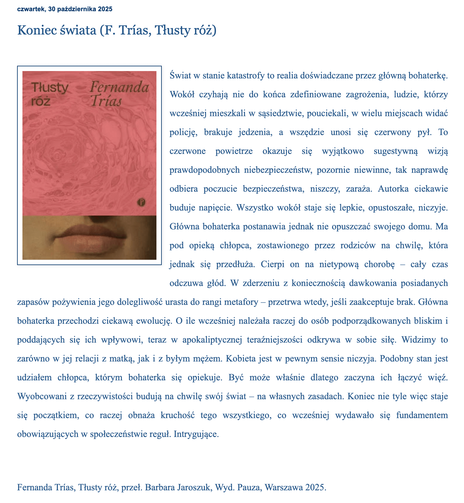 Koniec świata – recenzja książki „Tłusty róż” Fernandy Trías na blogu Bernadetty Darskiej