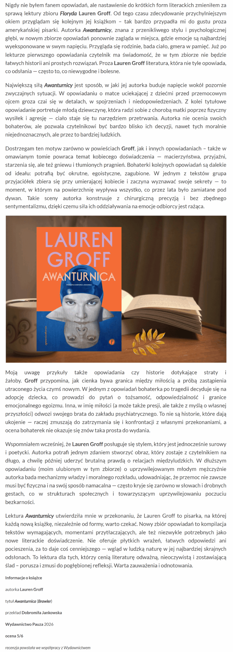 Autorka Awanturnicy, znana z przenikliwego stylu i psychologicznej głębi, w nowym zbiorze opowiadań ponownie zagląda w miejsca, gdzie emocje są najbardziej wyeksponowane w swym napięciu. Przygląda się rodzinie, bada ciało, gmera w pamięć. Już po lekturze pierwszego opowiadania czytelnik ma świadomość, że w tym zbiorze nie będzie łatwych historii ani prostych rozwiązań. Proza Lauren Groff literatura, która nie tyle opowiada, co odsłania — często to, co niewygodne i bolesne.