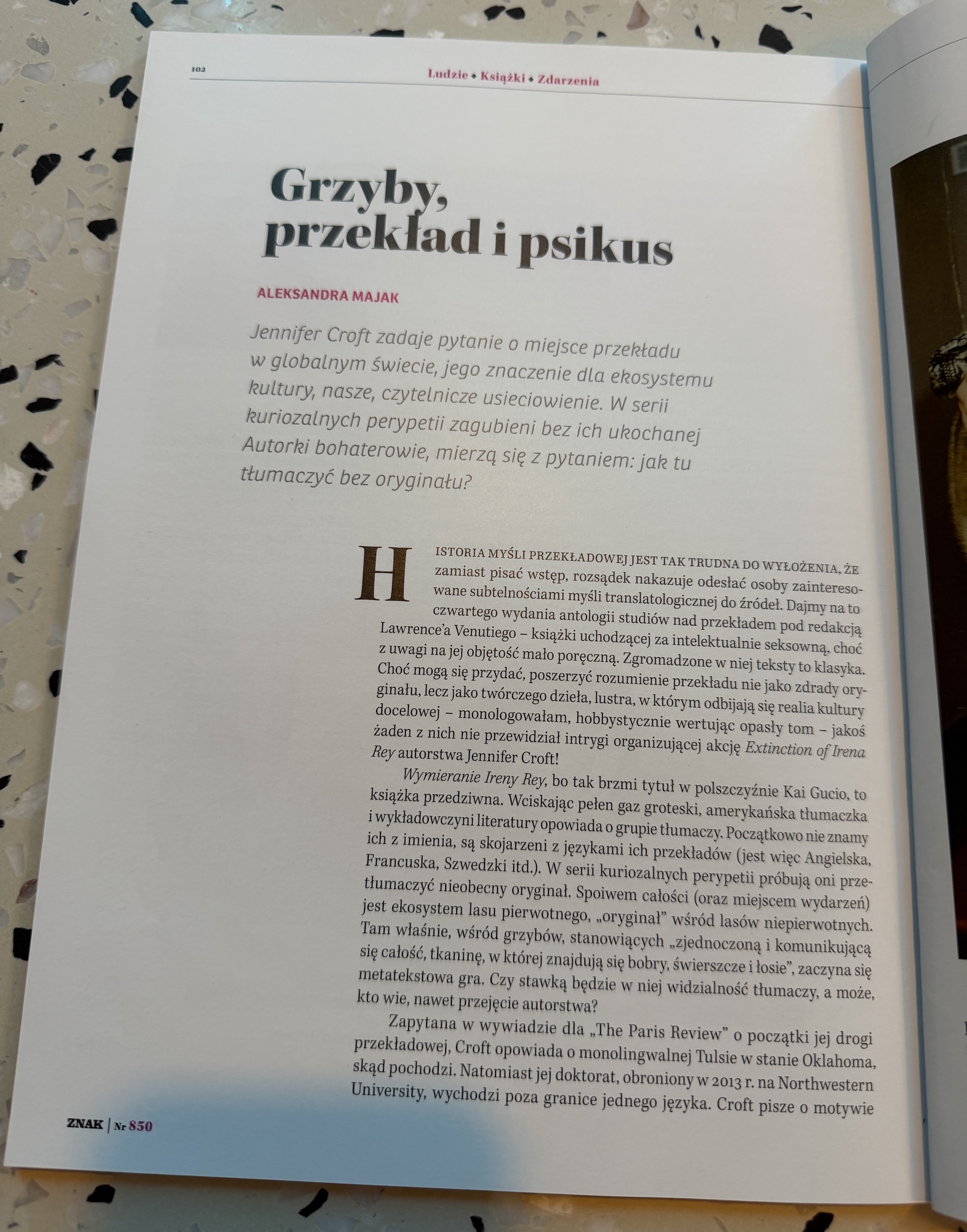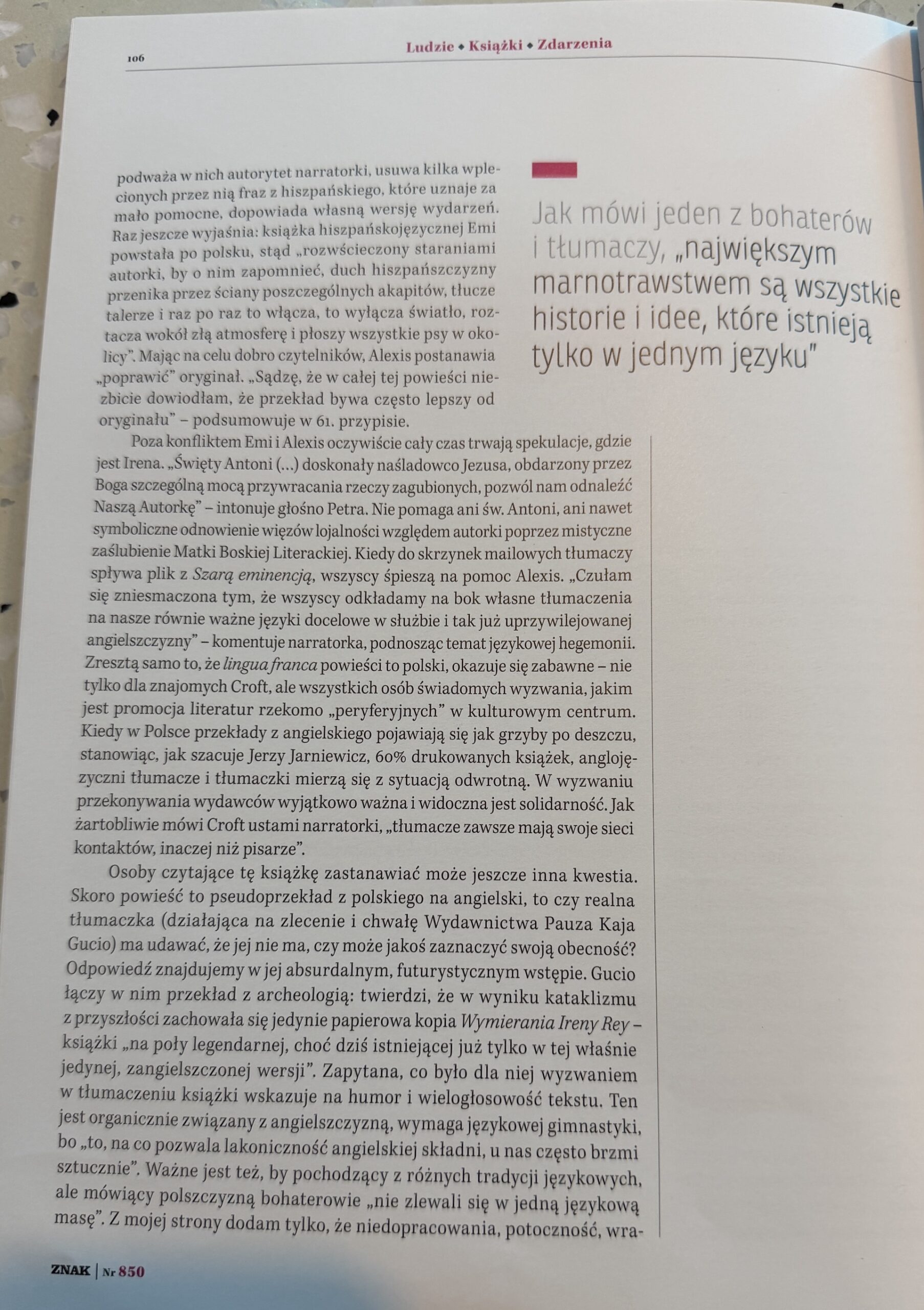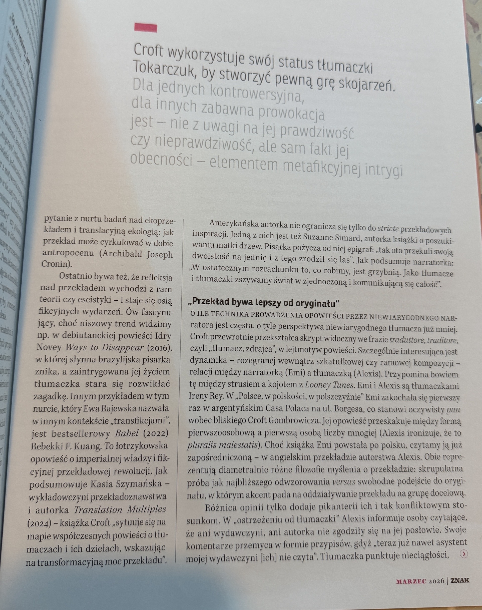 Jennifer Croft zadaje pytanie o miejsce przekładu w globalnym świecie, jego znaczenie dla ekosystemu kultury, nasze, czytelnicze usieciowienie. W serii kuriozalnych perypetrii zagubieni bez ich ukochanej Autorki bohaterowie, mierzą się z pytaniem: jak tu tłumaczyć bez oryginału?