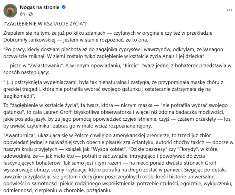 Recenzja powieści „Awanturnica” Lauren Groff opublikowana na serwisie Facebook na profilu Nogaś na stronie