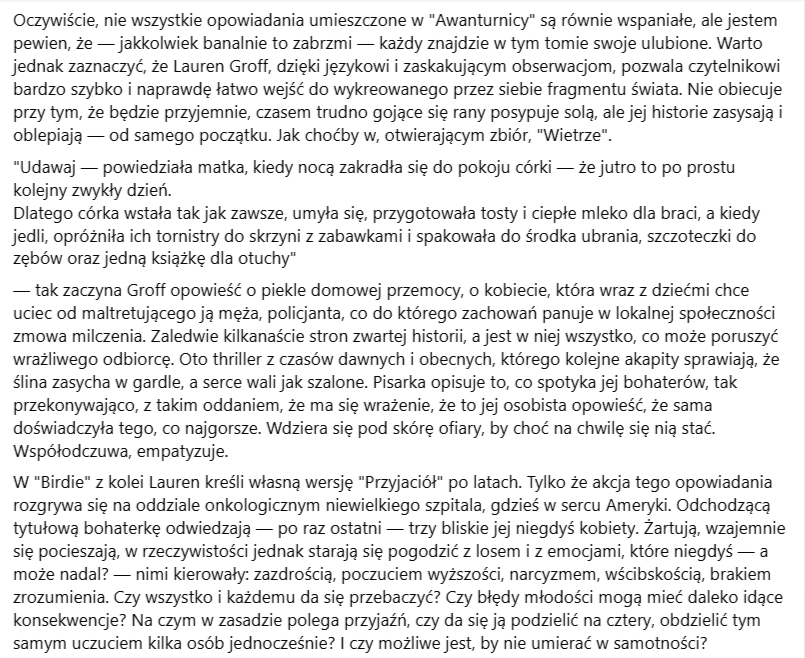 "Awanturnica", ukazująca się w Polsce chwilę po amerykańskiej premierze, to trzeci już zbiór opowiadań jednej z najważniejszych obecnie pisarek zza Atlantyku, autorki choćby takich — dobrze w naszym kraju przyjętych — książek jak "Wyspa kobiet", "Dzikie bezkresy" czy "Florydy", w której udowodniła, że — jak mało kto — potrafi pisać zwięźle, intrygująco i powoływać do życia fascynujących bohaterów. Tak samo jest i tym razem — na nieco ponad dwustu stronach Groff wyczarowuje obrazy, sceny i sytuacje, które potrafią na długo zostać w pamięci. Sięgając po detale, uważnie przyglądając się gestom i decyzjom poszczególnych osób, kreśli historie uniwersalne, opowieści o samotności, piekle rodzinnego współistnienia, potrzebie czułości, egoizmie, wykluczeniu, odmienności, cierpieniu w chorobie, pożądaniu.
