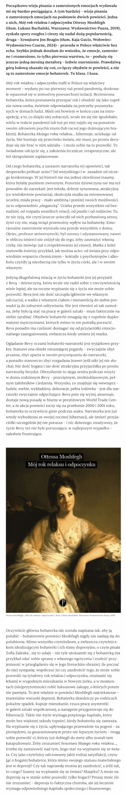 Początkowo wizja pisania o zamrożonych emocjach wydawała mi się bardzo pociągająca. A tym bardziej – wizja pisania o zamrożonych emocjach na podstawie dwóch powieści. Jedna z nich, Mój rok relaksu i odpoczynku Ottessy Moshfegh (tłum. Łukasz Buchalski, Warszawa: Wydawnictwo Pauza, 2019), zyskała spory rozgłos i cieszy się nadal dużą popularnością.
