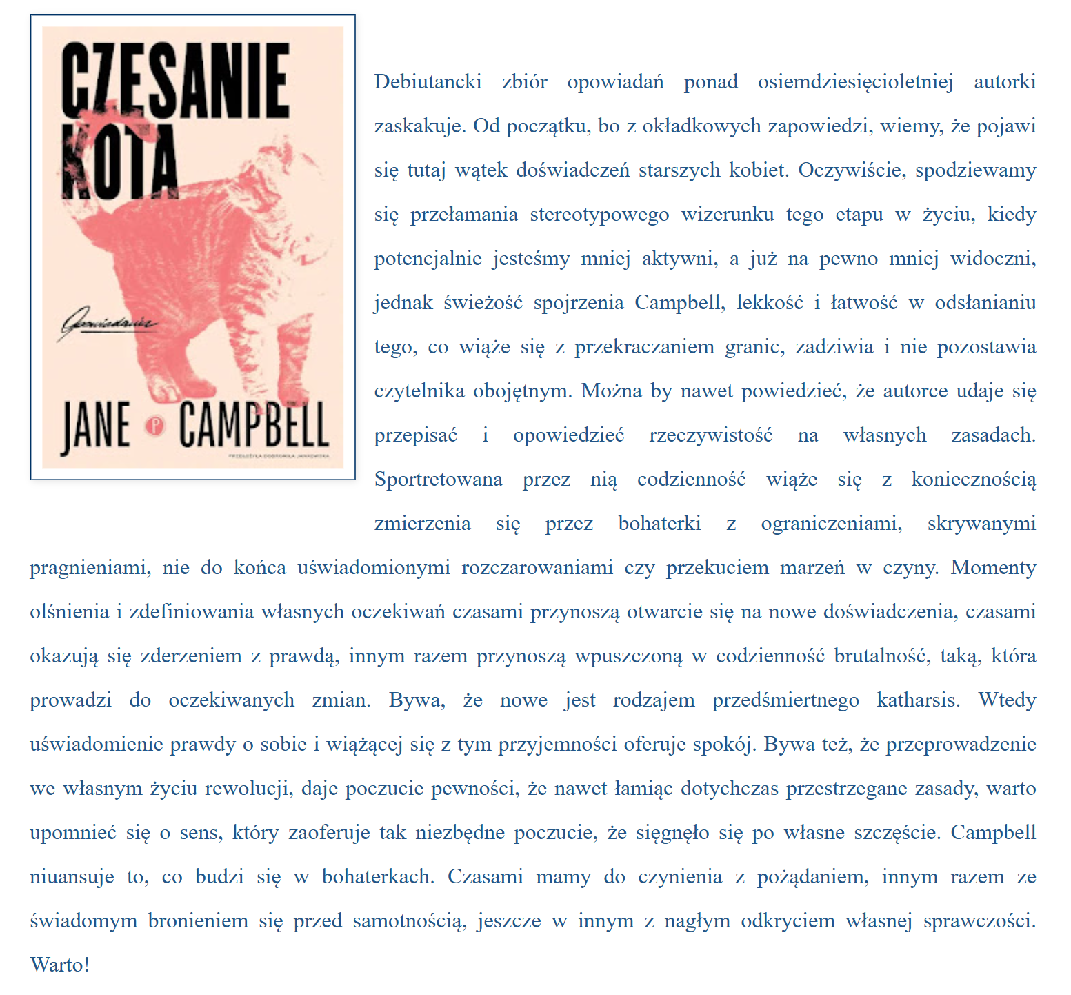 Rezencja opowiadań Jane Campbell „Czesanie kota” na blogu Bernadetty Darskiej