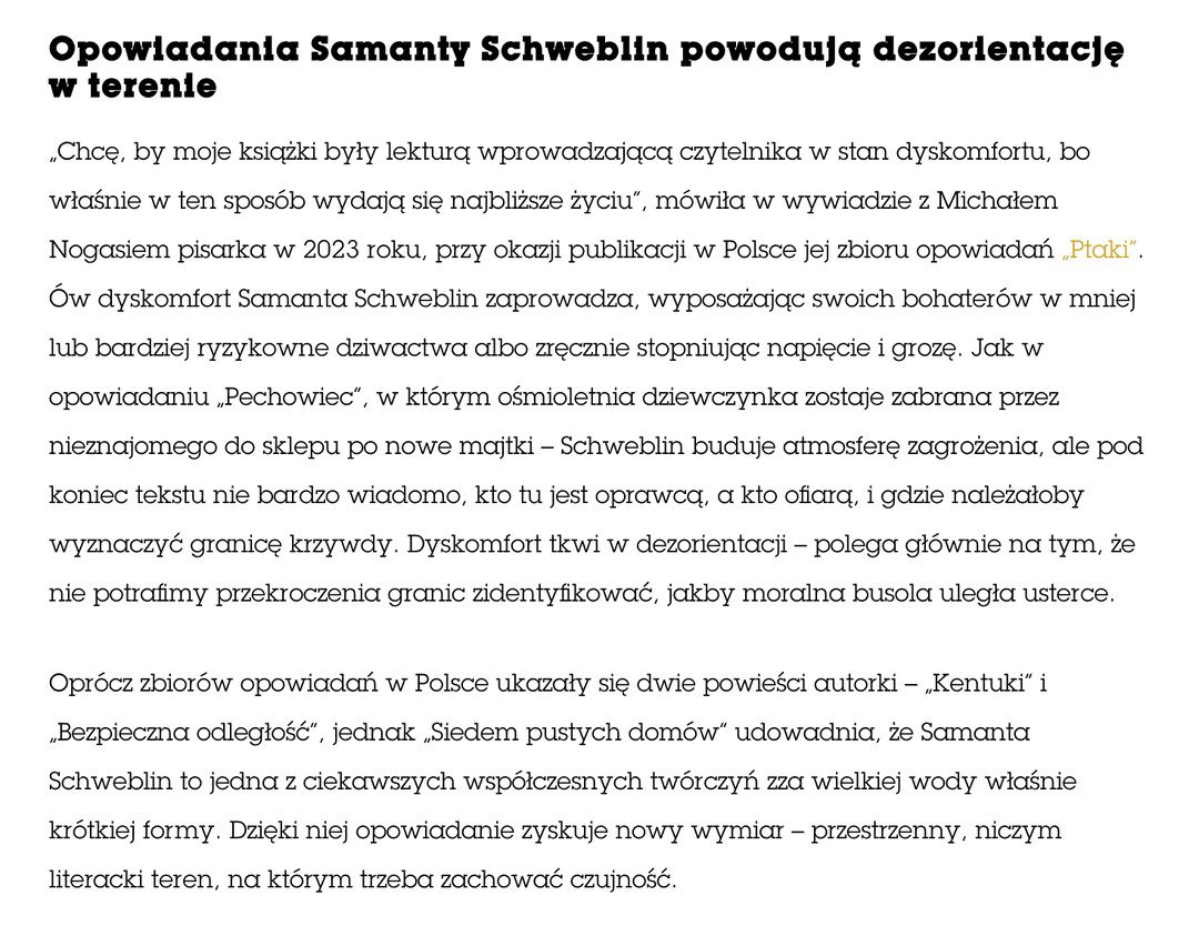 „Chcę, by moje książki były lekturą wprowadzającą czytelnika w stan dyskomfortu, bo właśnie w ten sposób wydają się najbliższe życiu”, mówiła w wywiadzie z Michałem Nogasiem pisarka w 2023 roku, przy okazji publikacji w Polsce jej zbioru opowiadań Ptaki. Ów dyskomfort Samanta Schweblin zaprowadza, wyposażając swoich bohaterów w mniej lub bardziej ryzykowne dziwactwa albo zręcznie stopniując napięcie i grozę. Jak w opowiadaniu Pechowiec, w którym ośmioletnia dziewczynka zostaje zabrana przez nieznajomego do sklepu po nowe majtki – Schweblin buduje atmosferę zagrożenia, ale pod koniec tekstu nie bardzo wiadomo, kto tu jest oprawcą, a kto ofiarą, i gdzie należałoby wyznaczyć granicę krzywdy. Dyskomfort tkwi w dezorientacji – polega głównie na tym, że nie potrafimy przekroczenia granic zidentyfikować, jakby moralna busola uległa usterce.